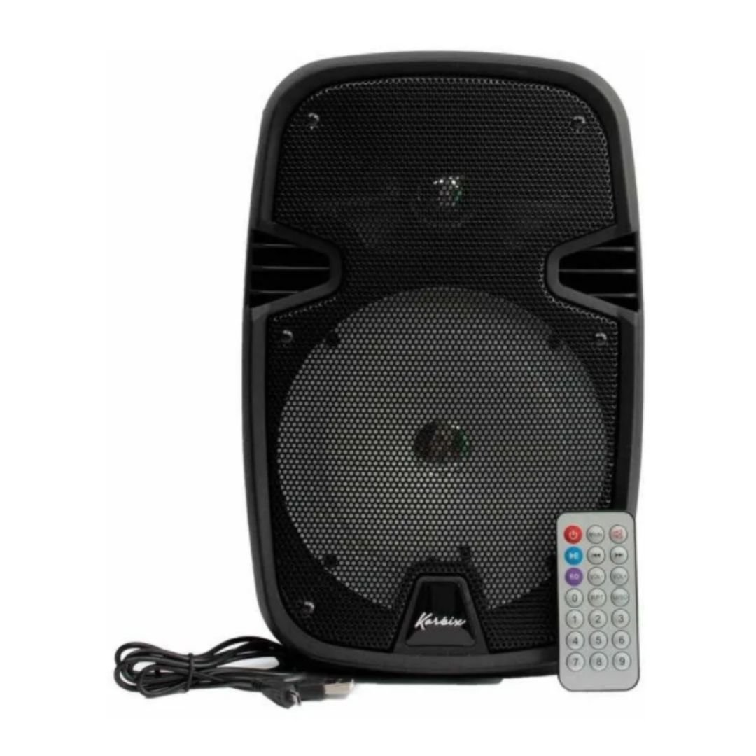 Espectacular oferta de sonido portátil, este hermoso parlante de sonido de alta fidelización, tiene la facilidad de reproducir por Bluetooth, USB, Micro SD Y FM Radio, con entrada Auxiliar, este hermoso parlante viene con un Micrófono Profesional de sonido nítido, un control con todas las funciones y lo puedas transportar sin problemas, el parlante trae batería de Litio de alta duración para que puedas armar las fiestas donde quieras o para que puedas hacer KARAOKE o lo que se le pueda ocurrir en cualquier lugar, el parlante tiene una pantalla digital.