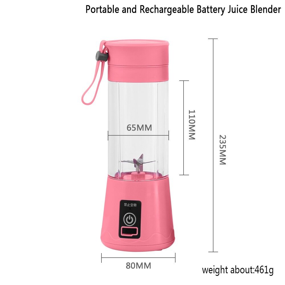 DESCRIPCIÓN Potencia: 200W Capacidad de la botella: 380 ml Color: verde, rosa, azul Material de la botella: PP + PC + ABS de plástico SUS304 lámina del acero inoxidable Tipo de motor: DC3.6V Velocidad del motor: 15000-22000rpm Carga mediante un cable USB Corriente de trabajo: 10-12A Tipo de batería: 2000mAh 3.7V Dimensiones del producto: 75 mm * 75 mm * 230 mm El interruptor ON / OFF de alimentación tiene< bloqueo de seguridad: Contacto momentáneo.